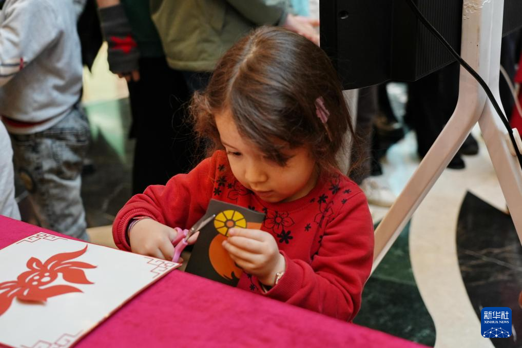 1月19日,在乌兹别克斯坦首都塔什干的一处购物中心,一名儿童在“欢乐春节·共庆中国年”活动上体验剪纸。