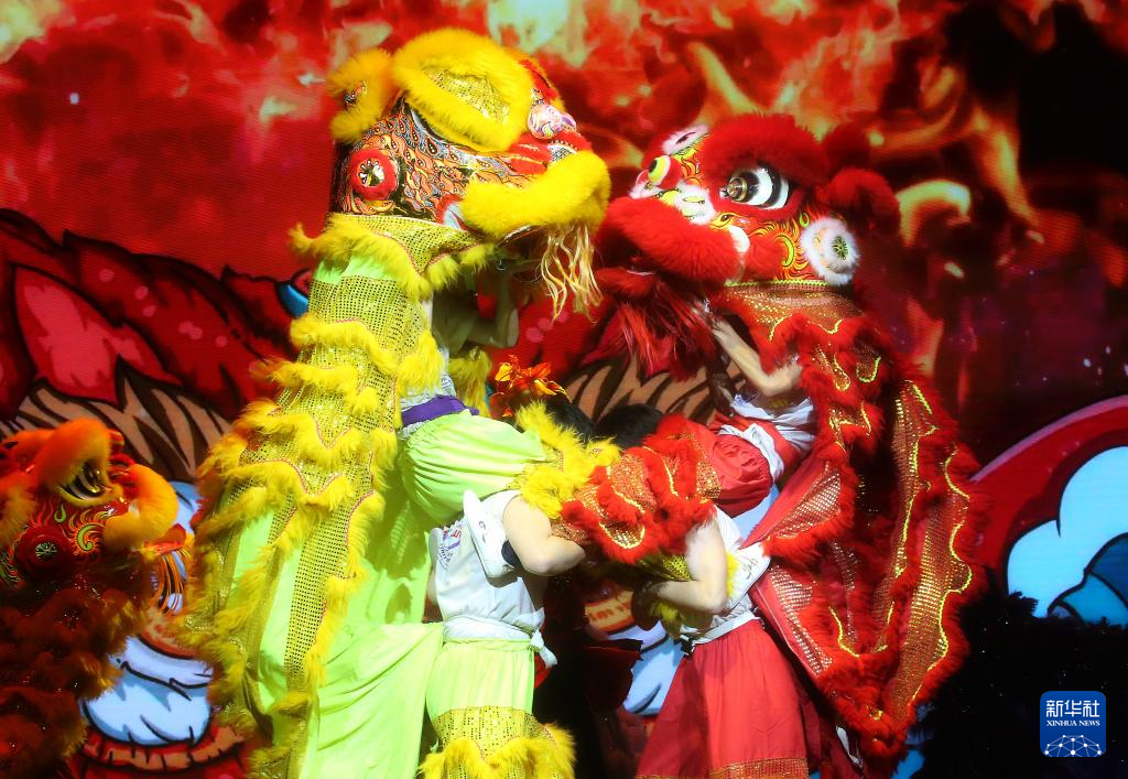 1月20日,在白俄罗斯首都明斯克,来自中国的学生在中白学生春节联欢晚会上表演舞狮。