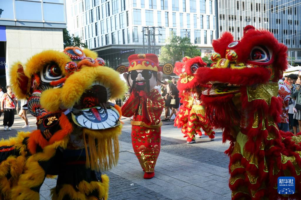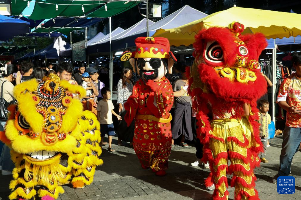 这是1月18日在缅甸仰光的一处市集拍摄的为迎接中国农历春节举办的舞狮表演。