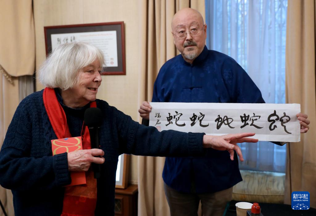 1月23日,在英国首都伦敦举行的“欢乐春节——非遗雅集”活动上,英国汉学家弗朗西丝·伍德(中文名吴芳思)就汉字“蛇”的五种字体与观众交流。