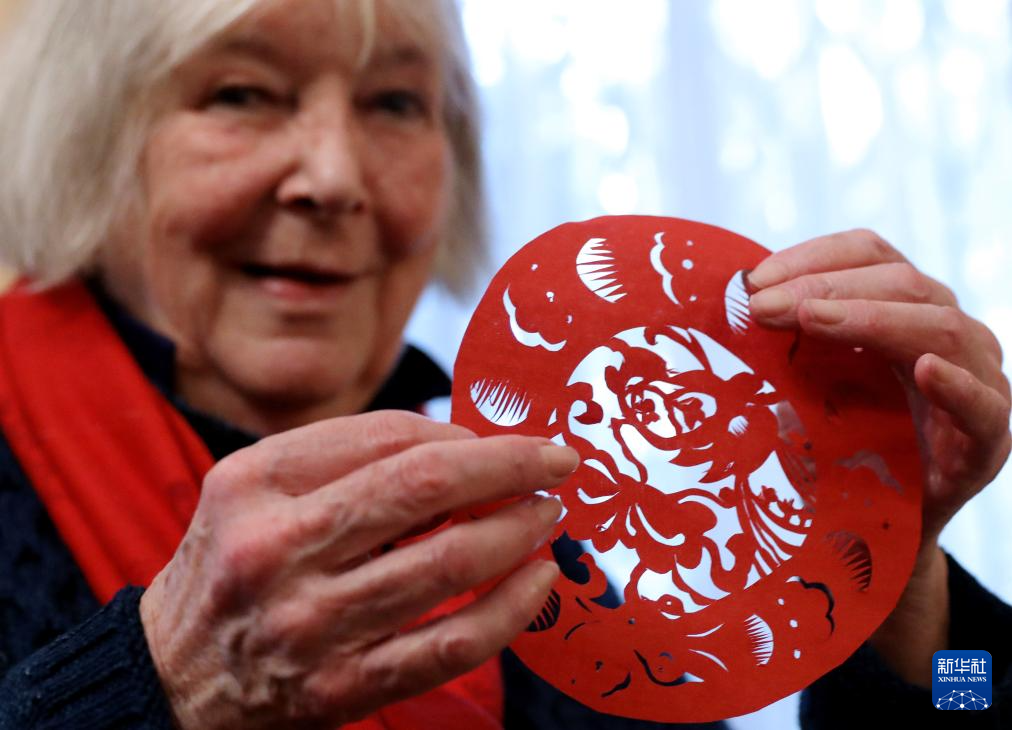 1月23日,在英国首都伦敦举行的“欢乐春节——非遗雅集”活动上,英国汉学家弗朗西丝·伍德(中文名吴芳思)展示剪纸作品。