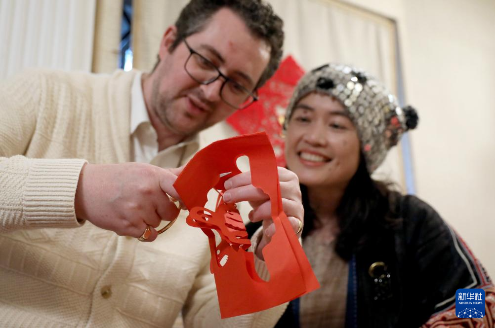 1月23日,一名男子在英国首都伦敦举行的“欢乐春节——非遗雅集”活动上学习剪纸。