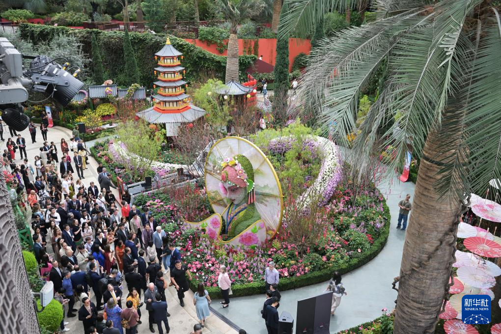 1月17日,游客在新加坡滨海湾花园花穹观赏《春花盛开之白蛇传》花卉展。