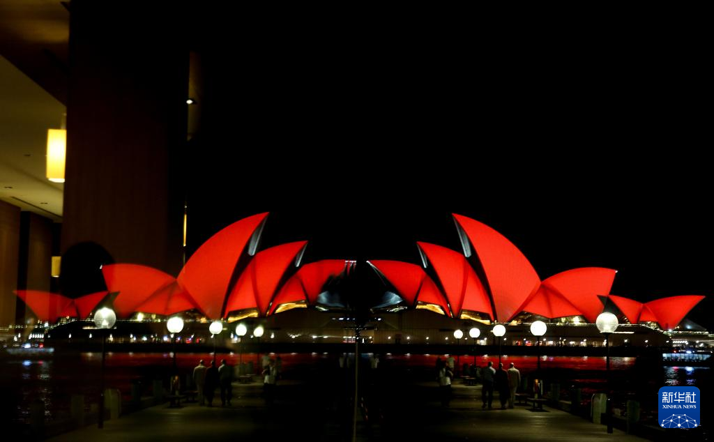 2月4日,澳大利亚悉尼歌剧院点亮“中国红”,庆祝中国农历新年。