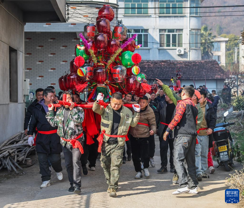2月10日,赤松镇虎岩村村民抬着板凳龙在村里巡游。