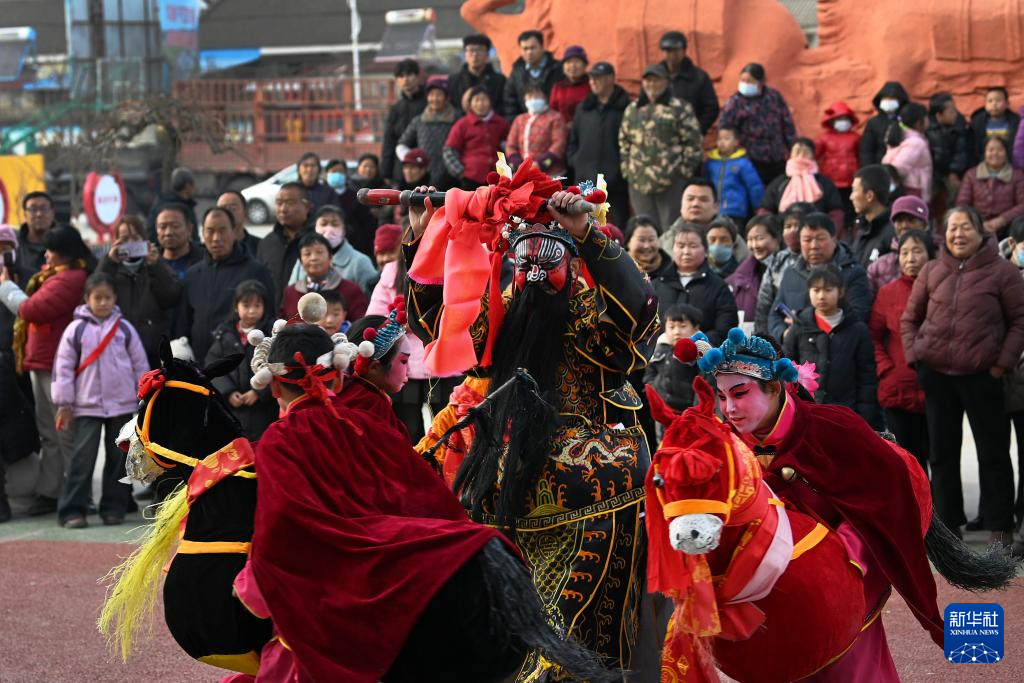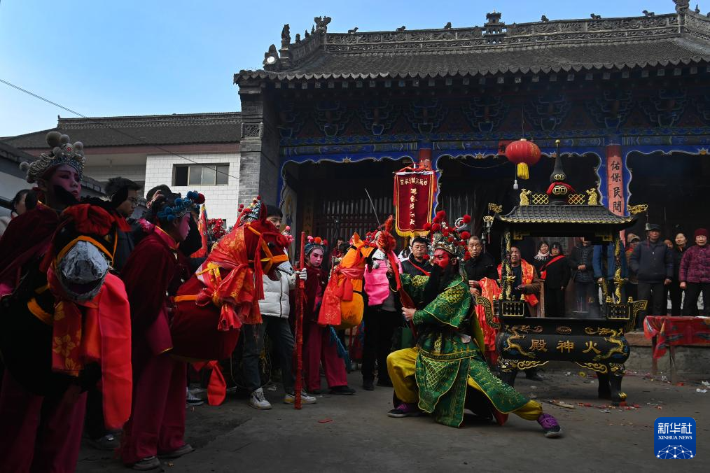 2月9日,陇县曹家湾镇流渠村社火队在陇县曹家湾镇三里营村进行游演。