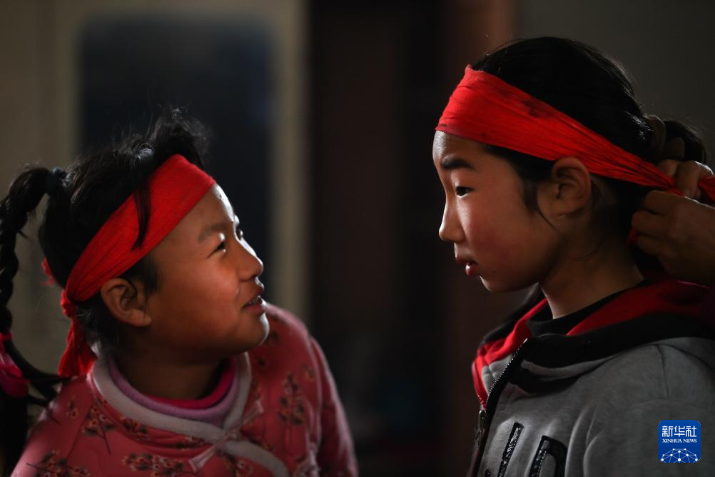 2月9日,陇县曹家湾镇流渠村社火队的孩子为同伴整理演出服装。