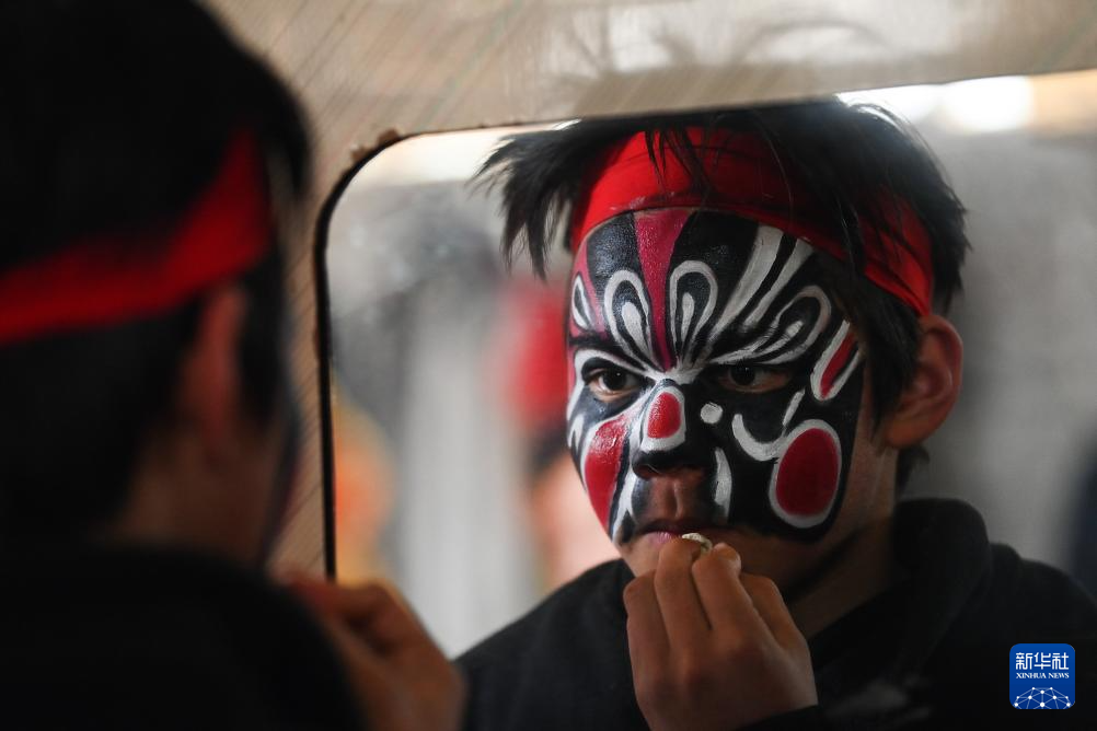 2月9日,陇县曹家湾镇流渠村社火队的少年在检查自己的社火脸谱。