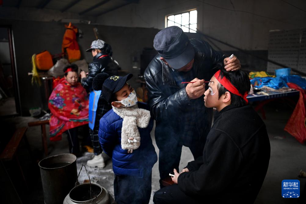 2月9日,陇县曹家湾镇流渠村的村民为社火队的孩子们绘制社火脸谱。