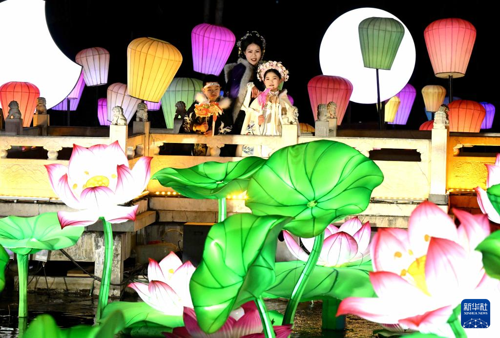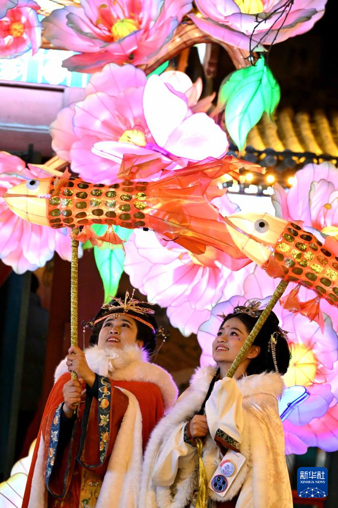 2月8日晚,身着传统服饰的游人在河北省石家庄市正定荣国府影视基地内游园赏花灯。