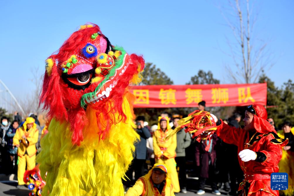 2月9日,河北省石家庄市元氏县群众表演舞狮。