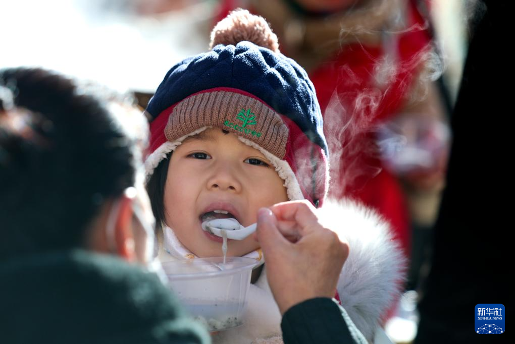 2月11日,在乌鲁木齐大巴扎步行街,小朋友在品尝汤圆。