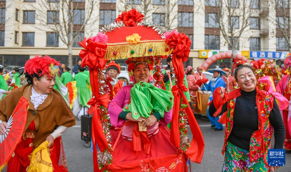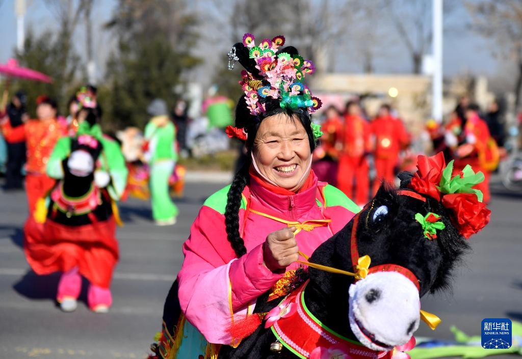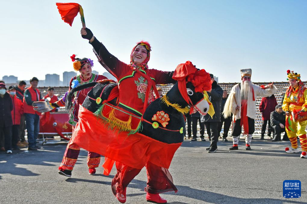 2月11日,民间艺人在河北省遵化市华明路街道表演民俗节目。
