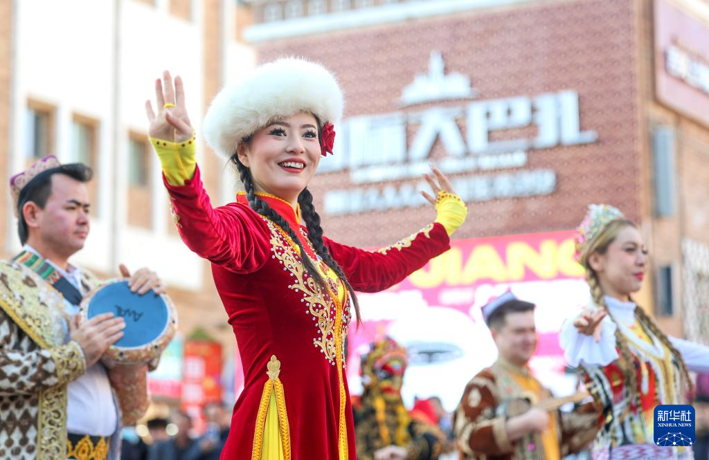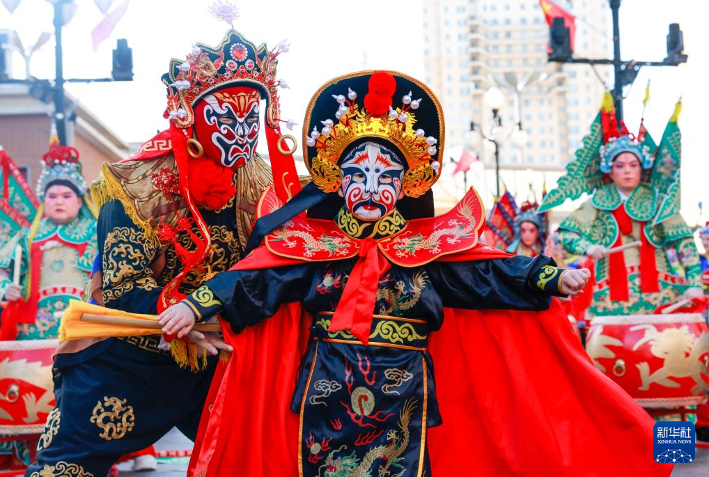 2月11日,演员在乌鲁木齐大巴扎步行街举办的社火巡游活动中表演。
