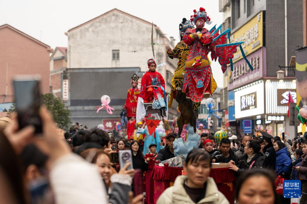 2月11日,在湖南省汨罗市长乐镇,人们参加抬阁故事会。“长乐抬阁故事会”是长乐镇当地一项传承千年的元宵节民俗活动,2011年入选国家级非物质文化遗产扩展项目名录。