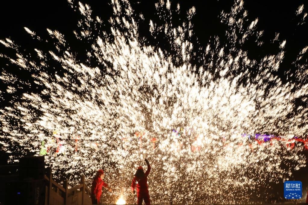2月10日晚,民间艺人在河南省焦作市温县陈家沟景区表演“打铁花”。