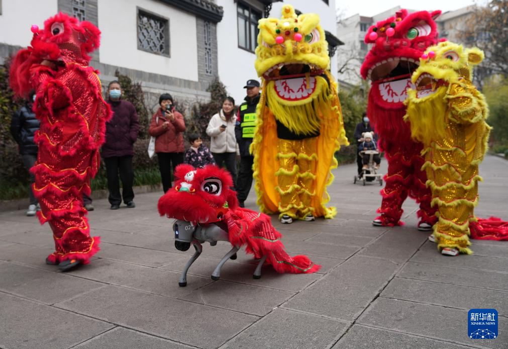 2月11日,在浙江杭州市西湖区北山街道元宵文化庙会活动中,机器狗与演员一起为社区居民进行舞狮表演。