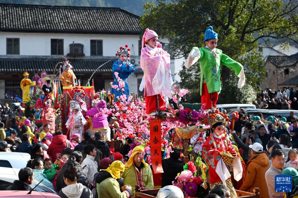 2月10日,浙江省武义县俞源古村举行“擎台阁”迎元宵大型民俗展演活动,童男童女扮演的戏曲人物在村中巡游。