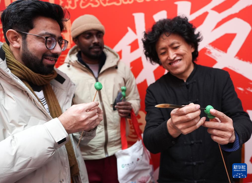2月11日,在辽宁沈阳马路湾街道,外国朋友获赠糖人礼物。