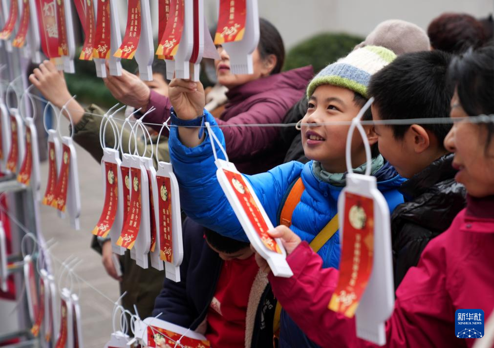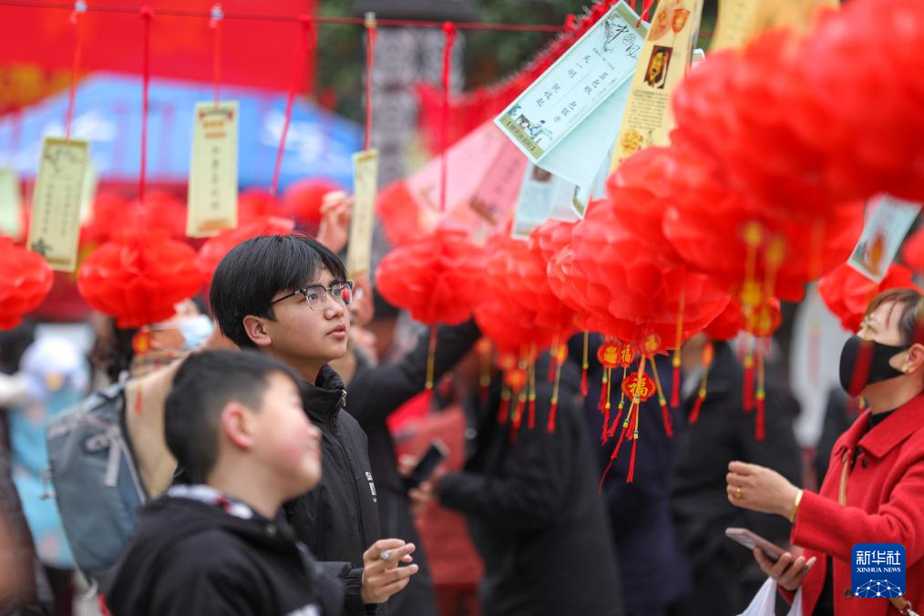 2月11日,在浙江杭州市西湖区北山街道元宵文化庙会活动中,社区居民在猜灯谜。