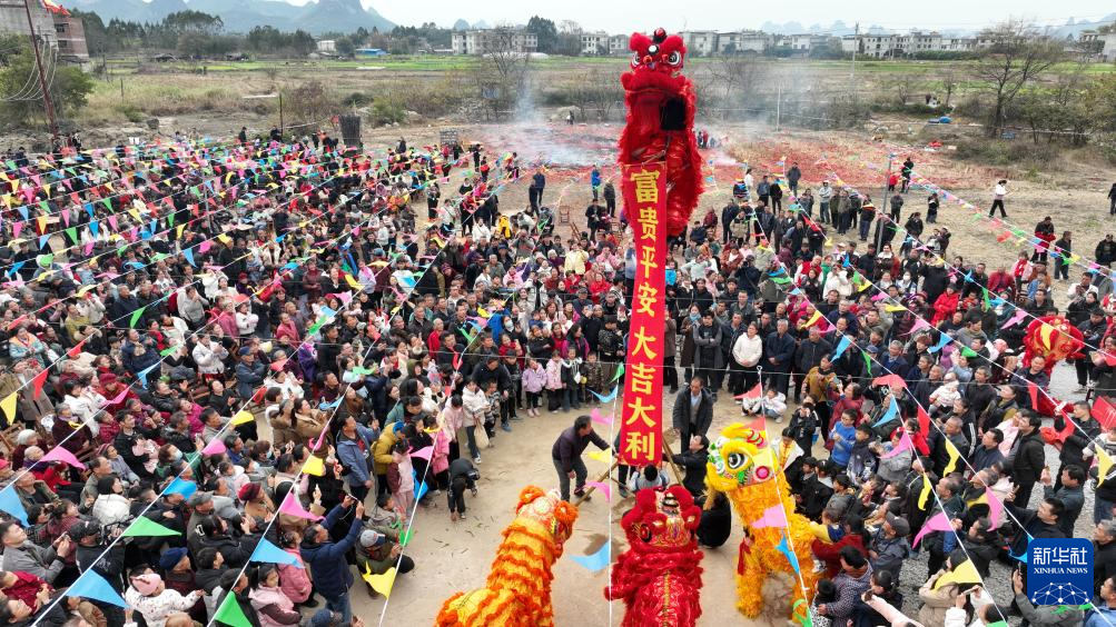 2月9日,广西柳州市柳江区进德镇四连村土垢屯,村民在客家“上灯节”活动上进行舞狮表演(无人机照片)。