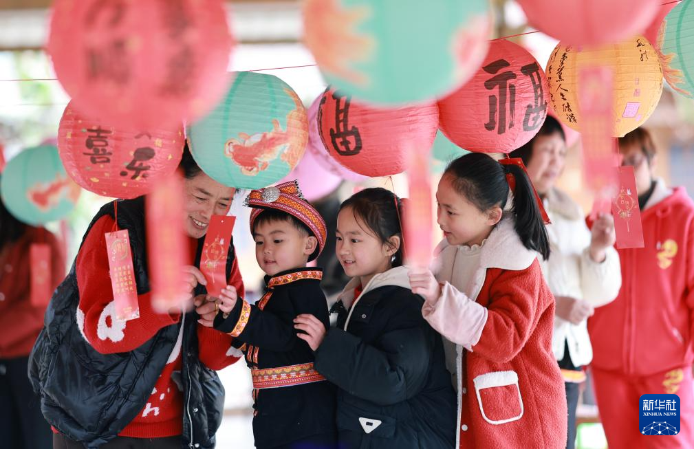 2月10日,人们在广西桂林市灵川县兰田瑶族乡西江寨参与猜灯谜活动。