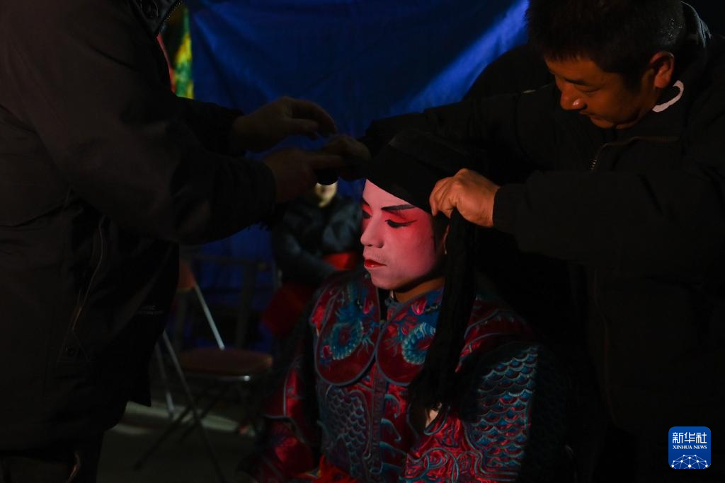 2月11日凌晨,村民为黄花峪村社火队成员穿戴演出服饰。