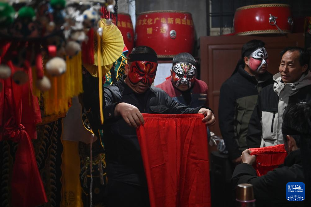 2月11日凌晨,黄花峪村社火队成员在整理演出服饰。