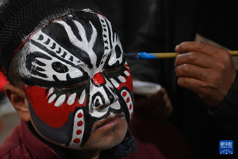2月11日凌晨,黄花峪村的脸谱手艺人为社火队成员绘制脸谱。