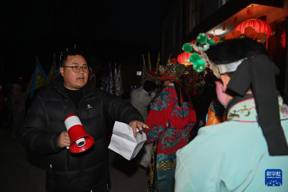 2月11日凌晨,黄花峪村村支书田涛在组织社火队排队出发。