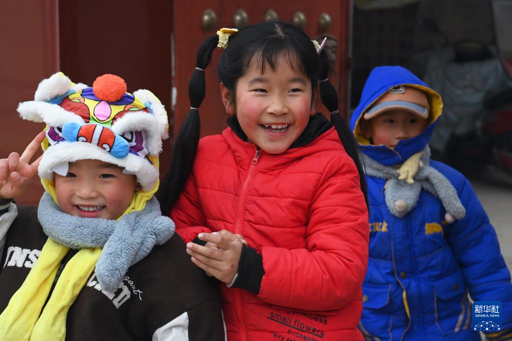 2月11日上午,黄花峪村的小朋友在家门口观看马社火游演。