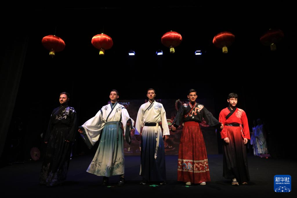 2月12日,演员在约旦首都安曼举办的“欢乐春节·元宵联欢会”上表演汉服时装秀。