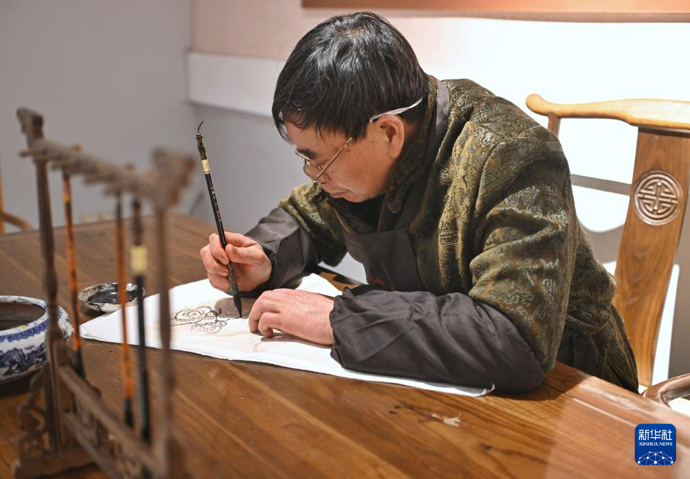 2月11日,毕六福在绘制油纸伞图案。