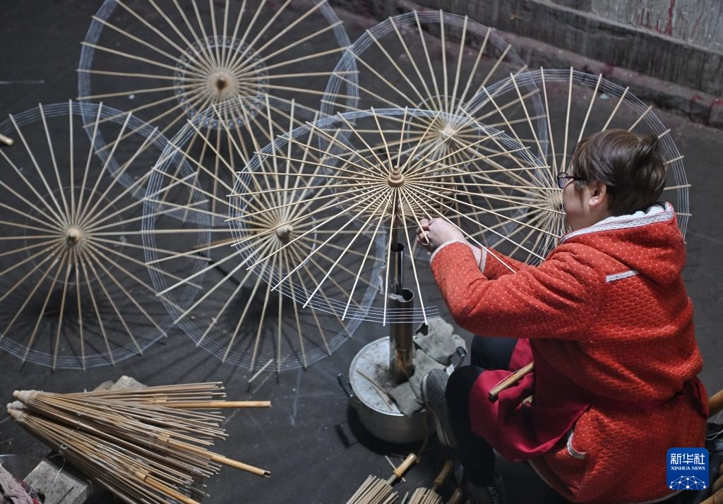 2月11日,制伞师在制作油纸伞。