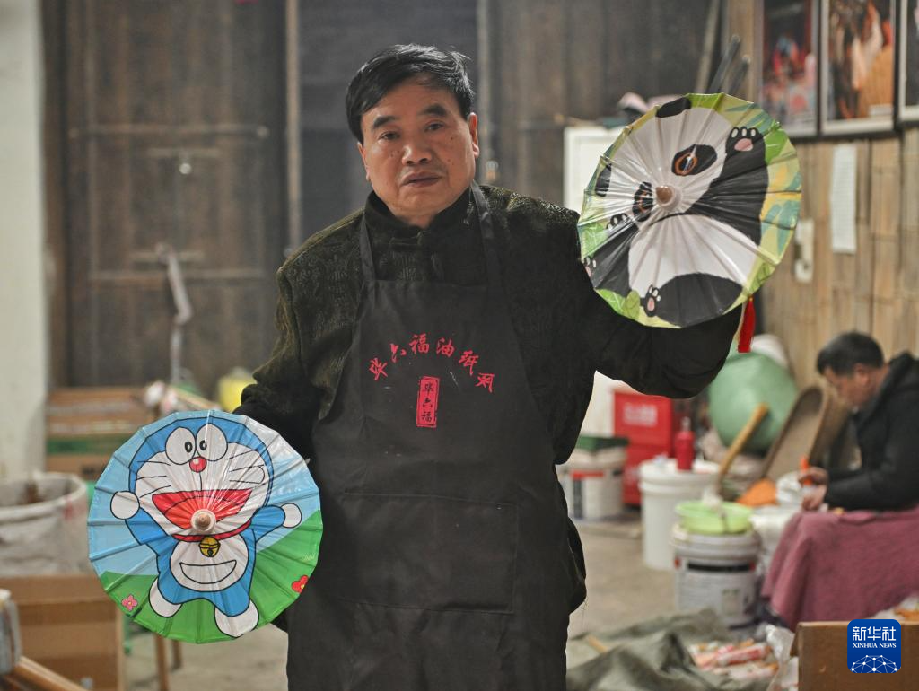 2月11日,毕六福展示印有卡通图案和熊猫图案的油纸伞。