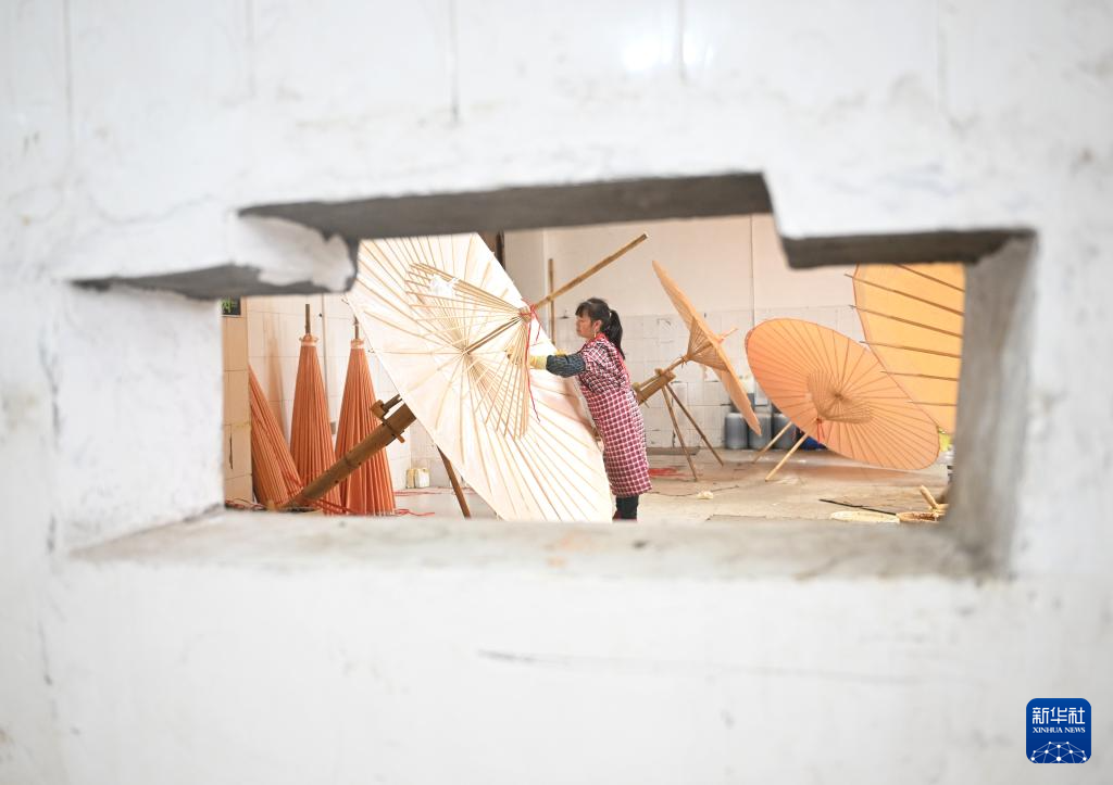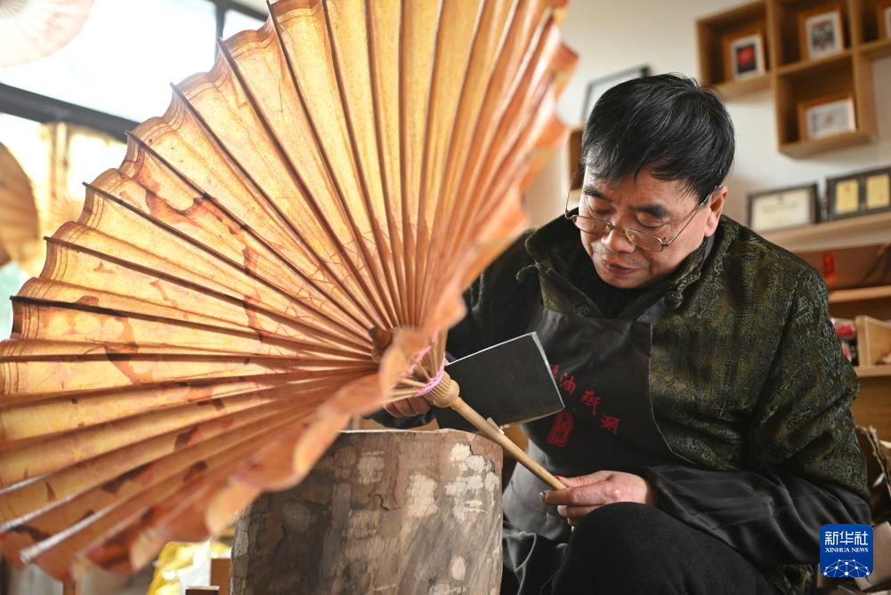2月11日,制伞师在为油纸伞上桐油。