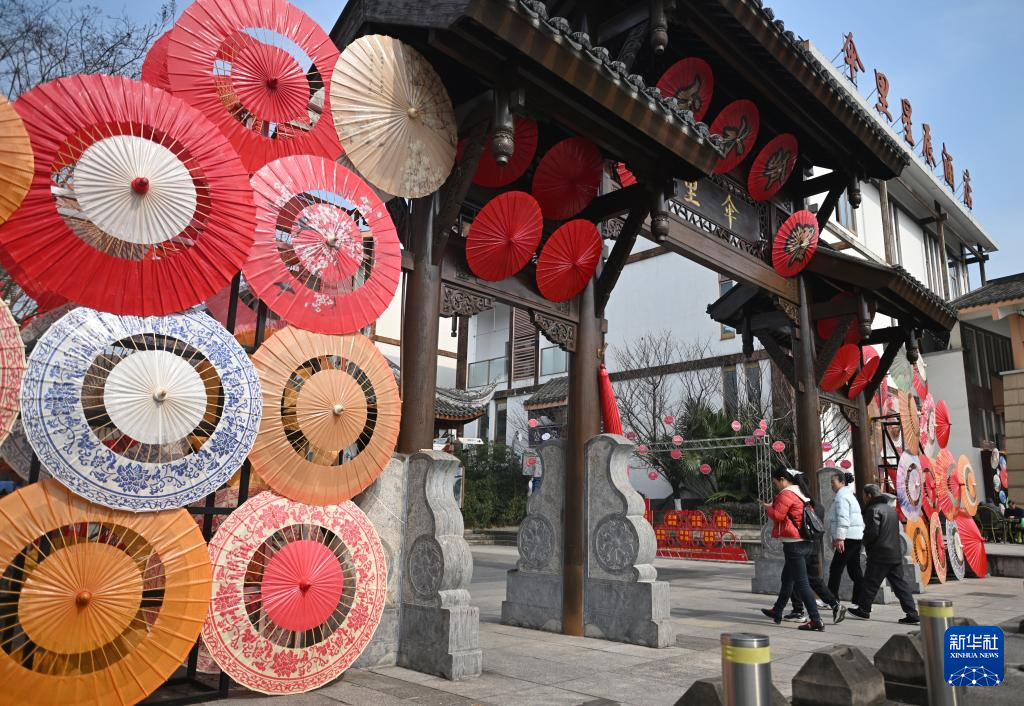 2月11日,游人在分水岭镇以油纸伞为主题的伞里街区游玩。