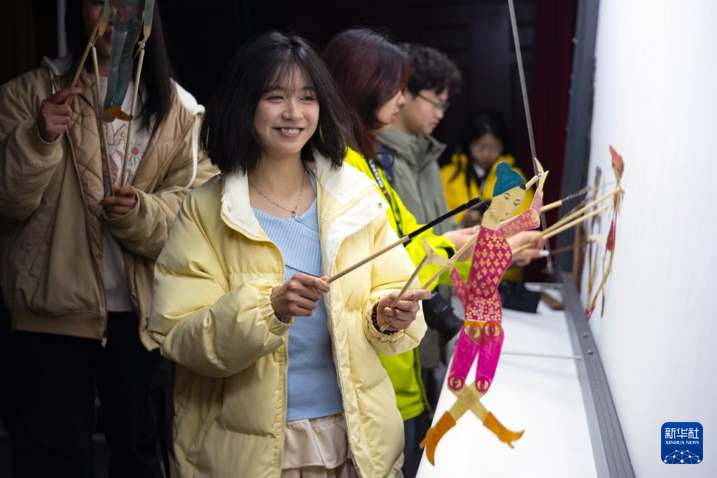 在位于阆中市的四川王皮影艺术博物馆,年轻观众受邀上台体验表演皮影戏《迪斯科》(2月19日摄)。