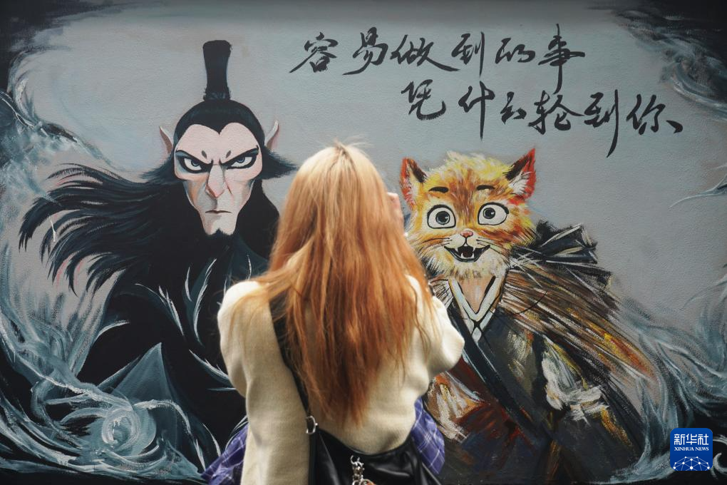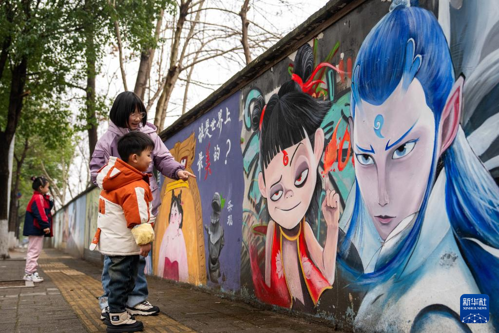 2月23日,市民在长沙市岳麓区岳麓街道五星村观看哪吒主题墙绘。