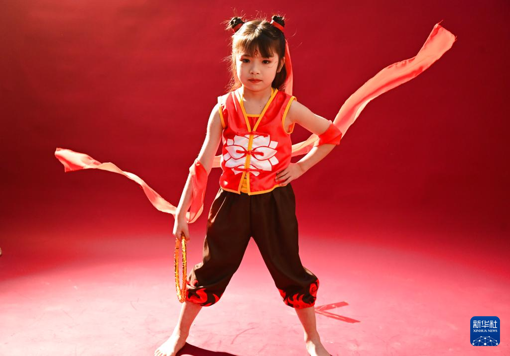 2月22日,小朋友在山东省聊城市的一家儿童影像馆拍摄哪吒主题写真。