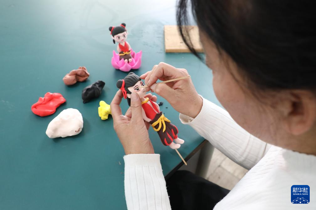 2月20日,泥塑艺人杨爱华在山东省滨州市的一所小学创作哪吒主题泥塑。