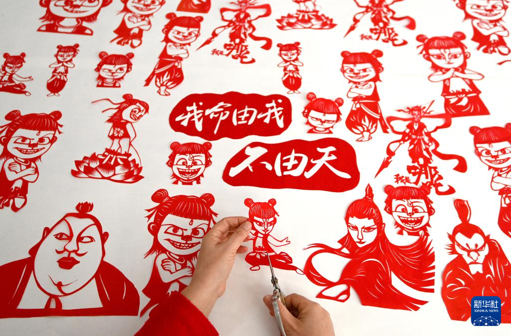 2月13日,河北省邯郸市一名剪纸艺人在创作哪吒主题剪纸作品。