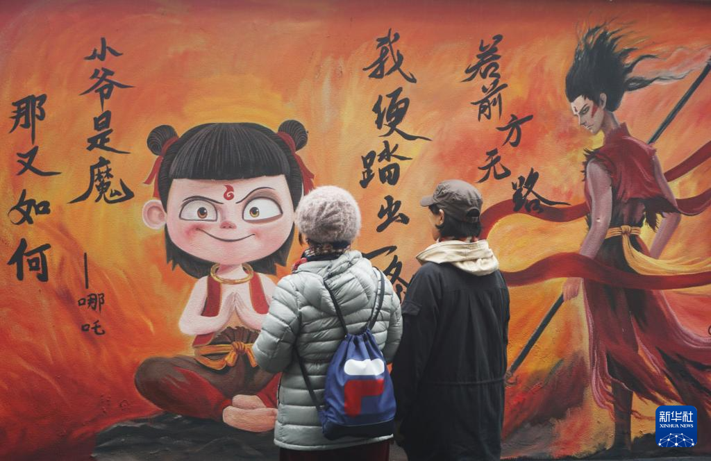 2月20日,市民在杭州街头观看哪吒主题墙绘。