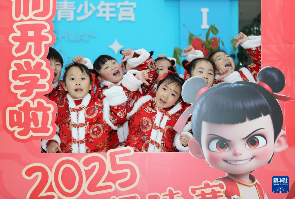 2月23日,在重庆市永川区青少年活动中心,孩子们与哪吒卡通形象合影。