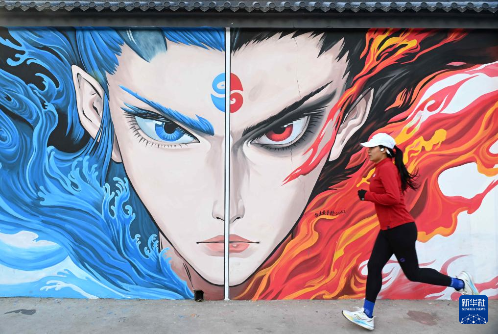 2月15日,市民从石家庄市裕华区一处哪吒主题墙绘前路过。