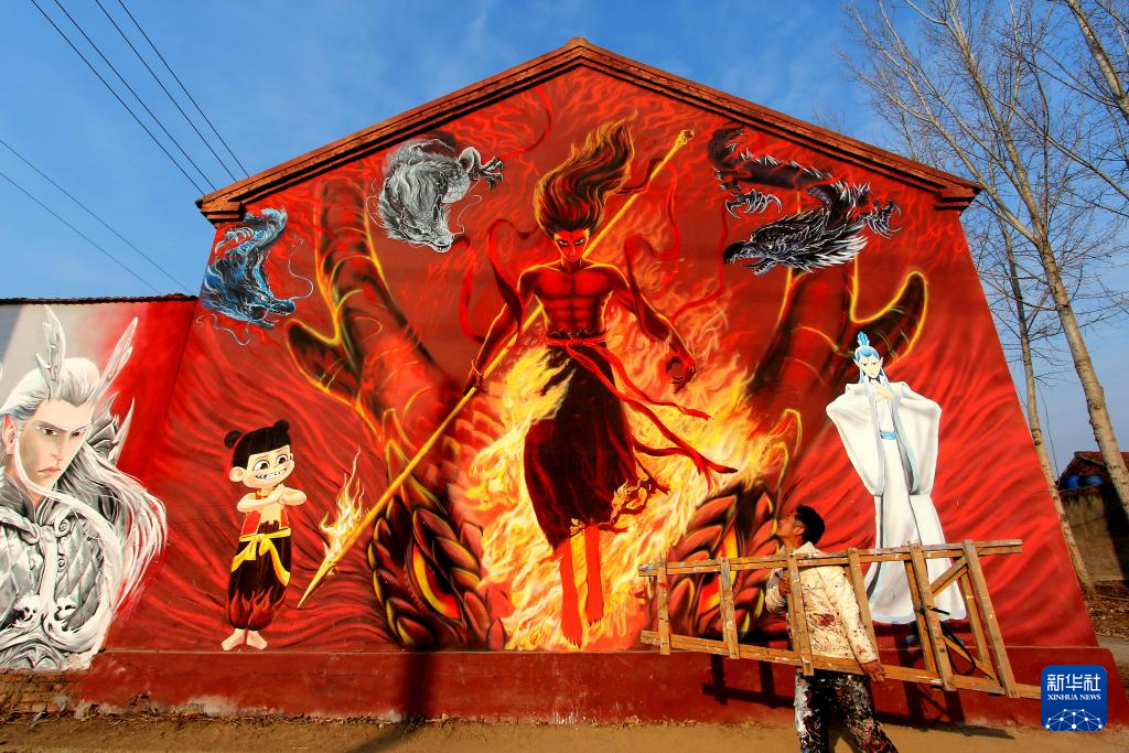 2月20日,山东省淄博市周村区沈家村村民沈靖宇从其创作的哪吒主题墙绘前走过。