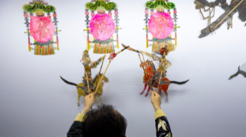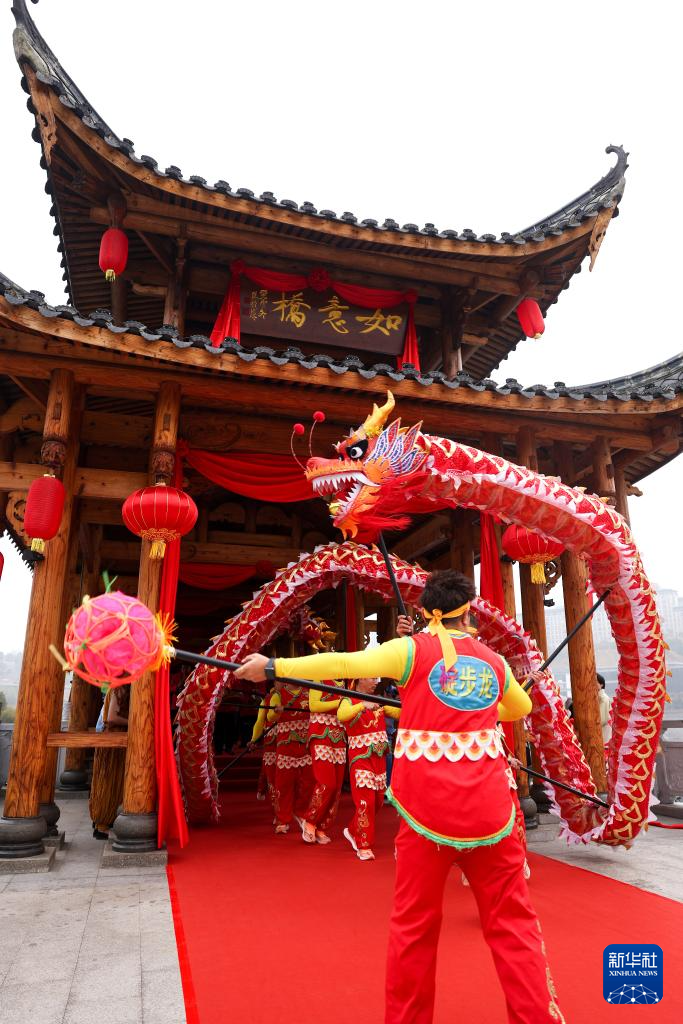2月25日,温州市泰顺县当地居民在新建廊桥如意桥圆桥仪式上进行碇步龙表演。