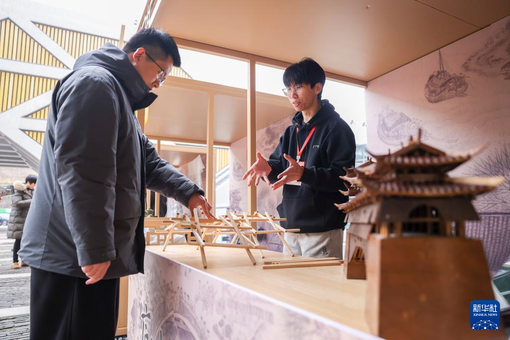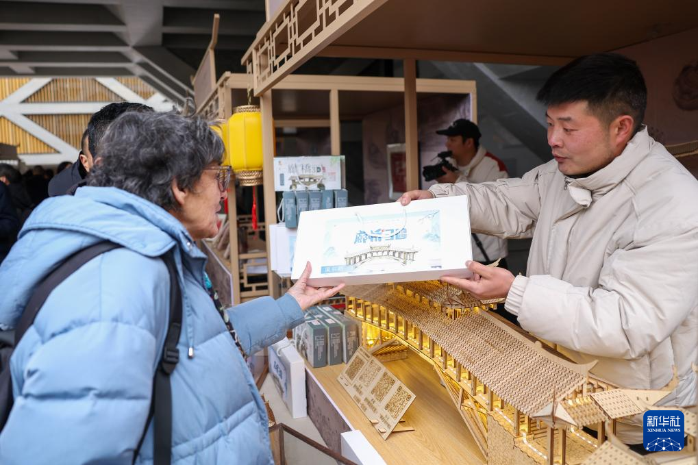 2月25日,在泰顺文化中心,工作人员(右)向参与廊桥市集的顾客介绍一款拼接廊桥模型。