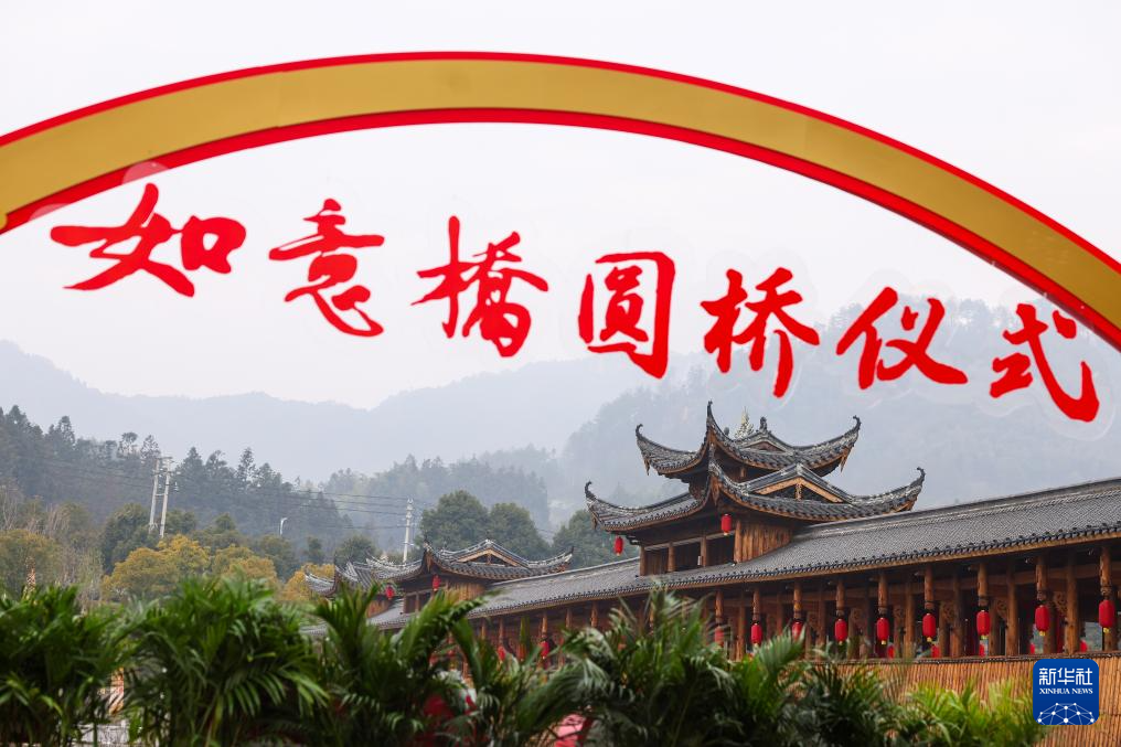 这是2月25日在浙江省温州市泰顺县拍摄的新建廊桥如意桥圆桥仪式现场。
