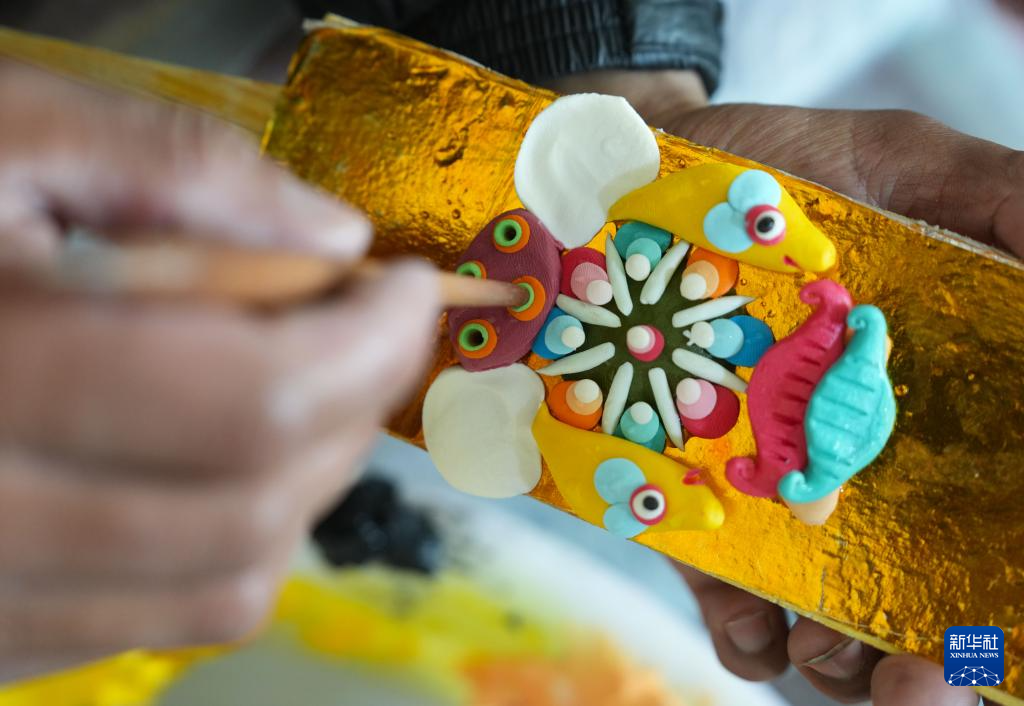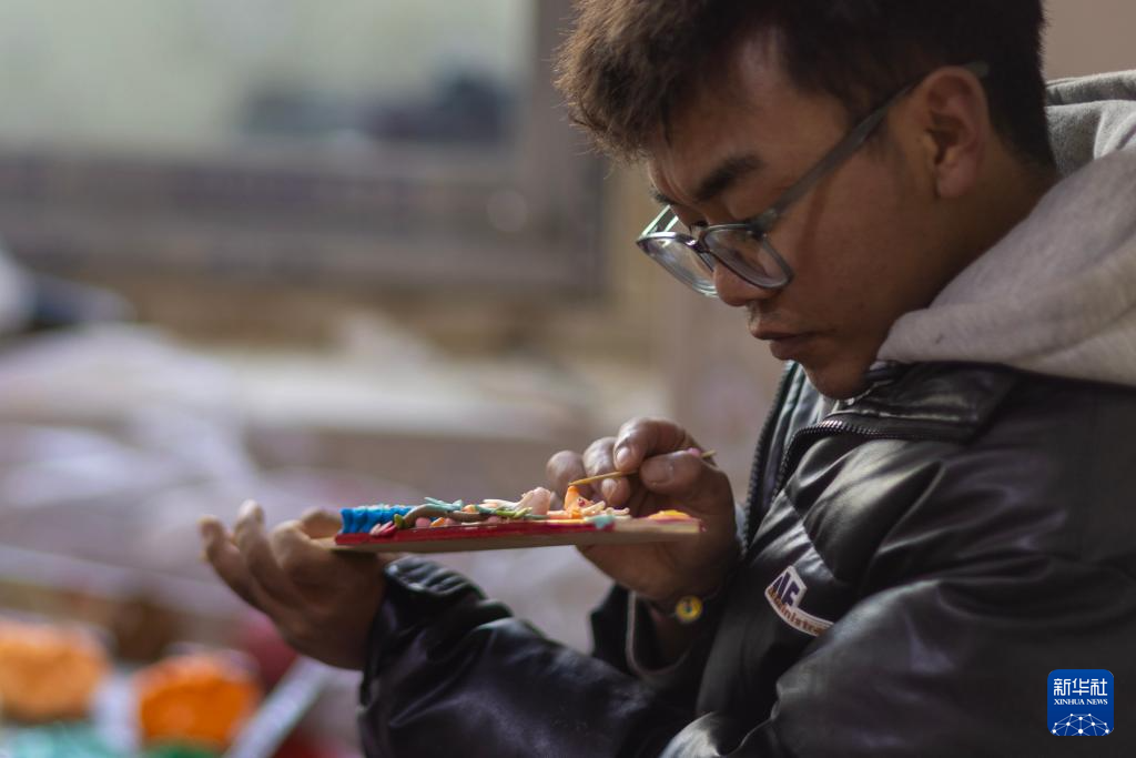 在拉萨市老城区,手工艺人在捏制酥油花(2月25日摄)。